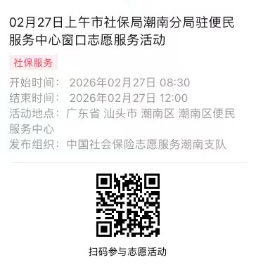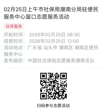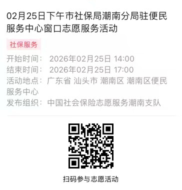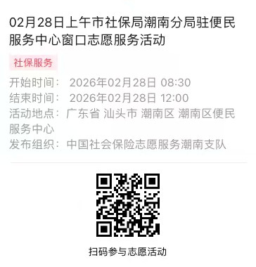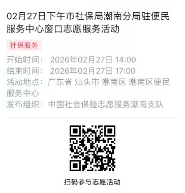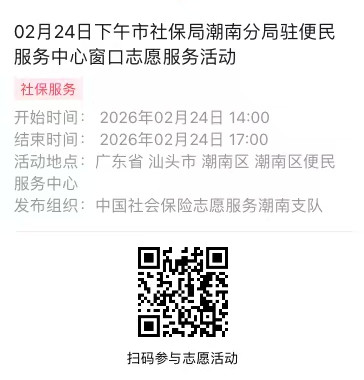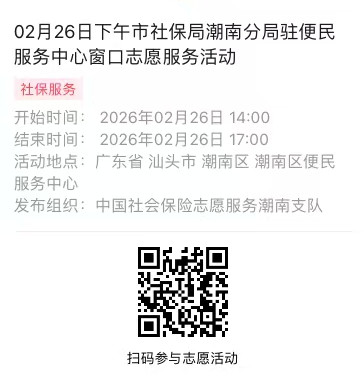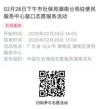 2026年02月24日至02月28日市社保局潮南分局驻便民服务中心窗口志愿服务活动,需要每一个可爱的你参与!