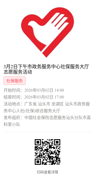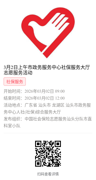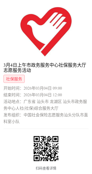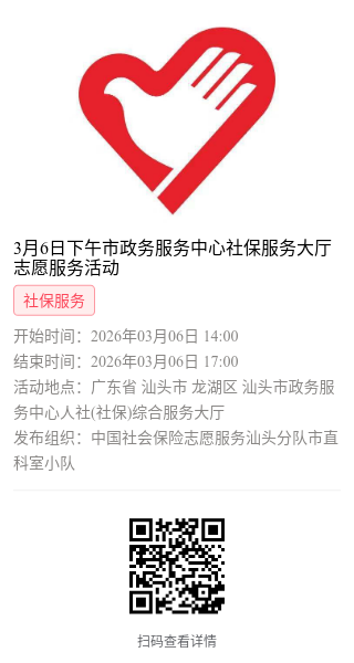 为充分保障我市社保志愿者权益,自2022年10月18日起,报名参加汕头市社保局和各分局志愿活动的同志须持有志愿者证并已激活,请各位志愿者遵照执行。