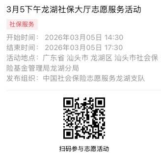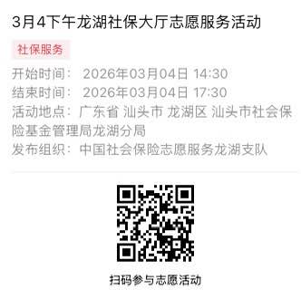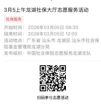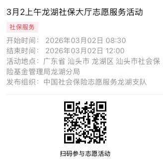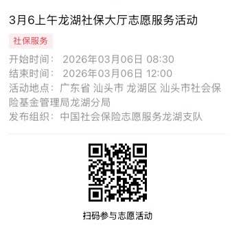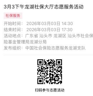 2026年3月2日至2026年3月6日市社保局龙湖分局大厅志愿服务活动,需要每一个可爱的你参与!