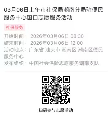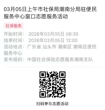 2026年03月02日至03月06日市社保局潮南分局驻便民服务中心窗口志愿服务活动,需要每一个可爱的你参与!