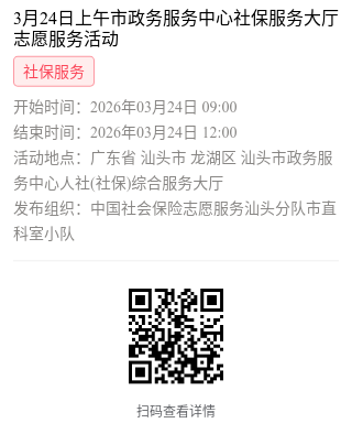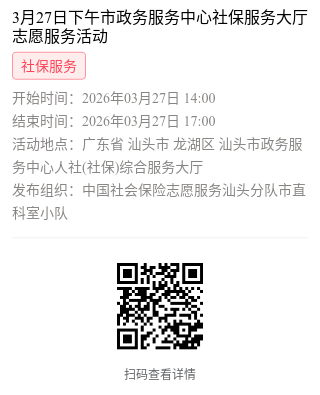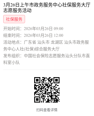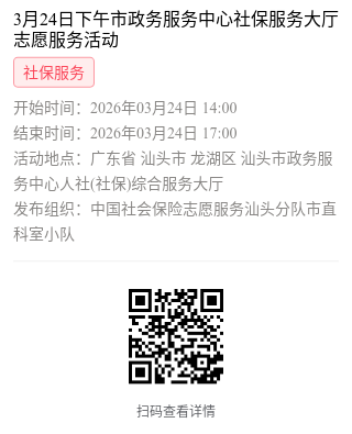 为充分保障我市社保志愿者权益,自2022年10月18日起,报名参加汕头市社保局和各分局志愿活动的同志须持有志愿者证并已激活,请各位志愿者遵照执行。