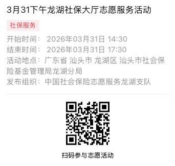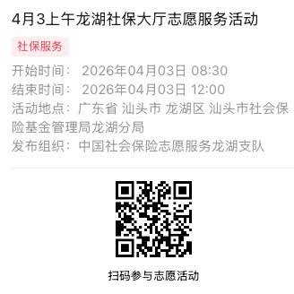 2026年3月30日至2026年4月3日市社保局龙湖分局大厅志愿服务活动,需要每一个可爱的你参与!