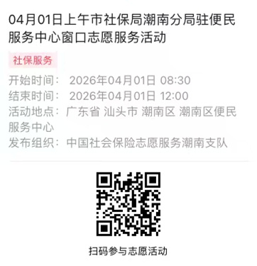 2026年03月30日至04月03日市社保局潮南分局驻便民服务中心窗口志愿服务活动,需要每一个可爱的你参与!
