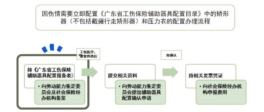 如因病情需要立即配置《广东省工伤保险辅助器具配置目录》中的矫形器(不包括截瘫行走矫形器)和压力衣的,应当持《广东省工伤保险辅助器具配置报备表》到所在市劳动能力鉴定委员会及社会保险经办机构备案。工伤医疗、康复终结后,再按照有关规定向市劳动能力鉴定委员会提出申请,经确认予以配置的,按照工伤保险有关规定支付费用。