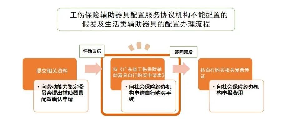 对工伤保险辅助器具配置服务协议机构不能配置的假发及生活类辅助器具,在所在市劳动能力鉴定委员会作出可以配置的结论后,工伤职工可提交《广东省工伤保险辅助器具自行购买申请表》,向社会保险经办机构申请自行购买。经社会保险经办机构同意后,自行购买并凭相关发票凭证到社会保险经办机构按规定报销费用。
