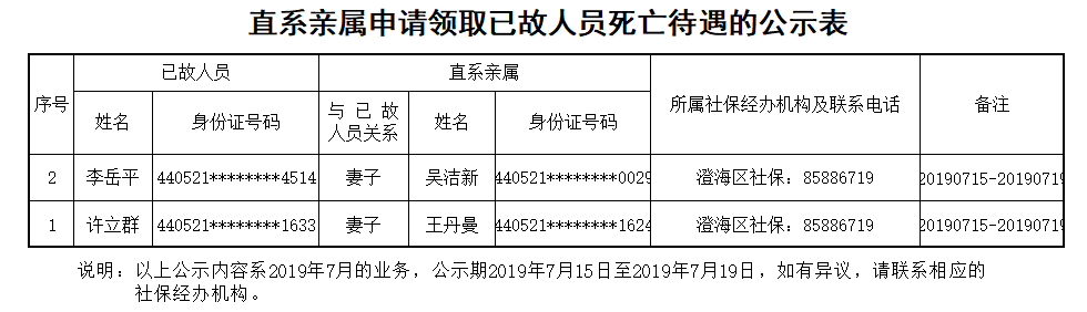 市社保澄海分局直系亲属申请领取已故人员死亡待遇的公示表(2019.07.15)