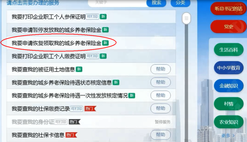 通过“粤智助”自助终端机(部署在全市各镇村),或银行自助终端进入政务服务-粤智助版块进行自助办理(在搜索栏输入“城乡”,点击“我要申请恢复领取我的城乡养老保险金”,按提示操作即可办理)。