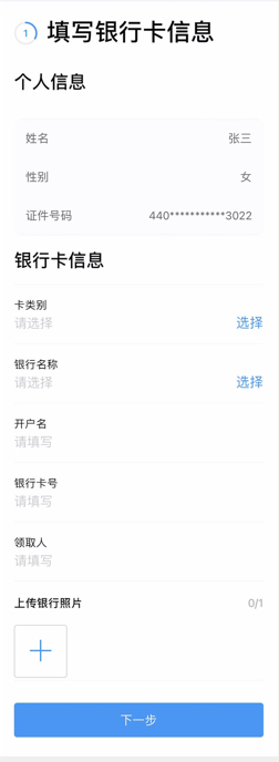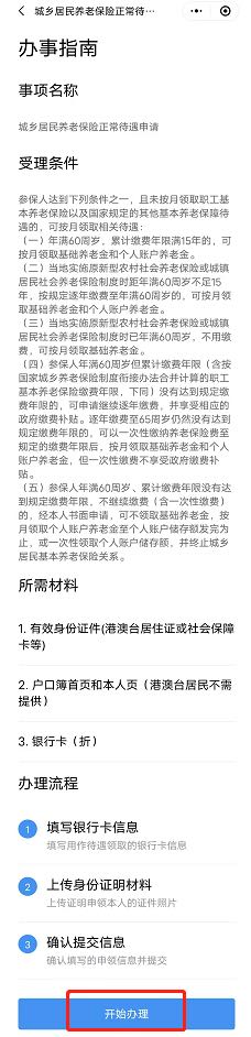 阅读“办事指南”后点击“开始办理”,完成“填写银行卡信息”、“上传身份证明材料”,确认信息无误,手写签名,点击“确认提交”。