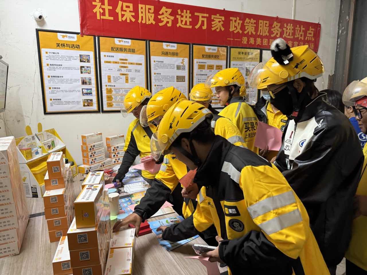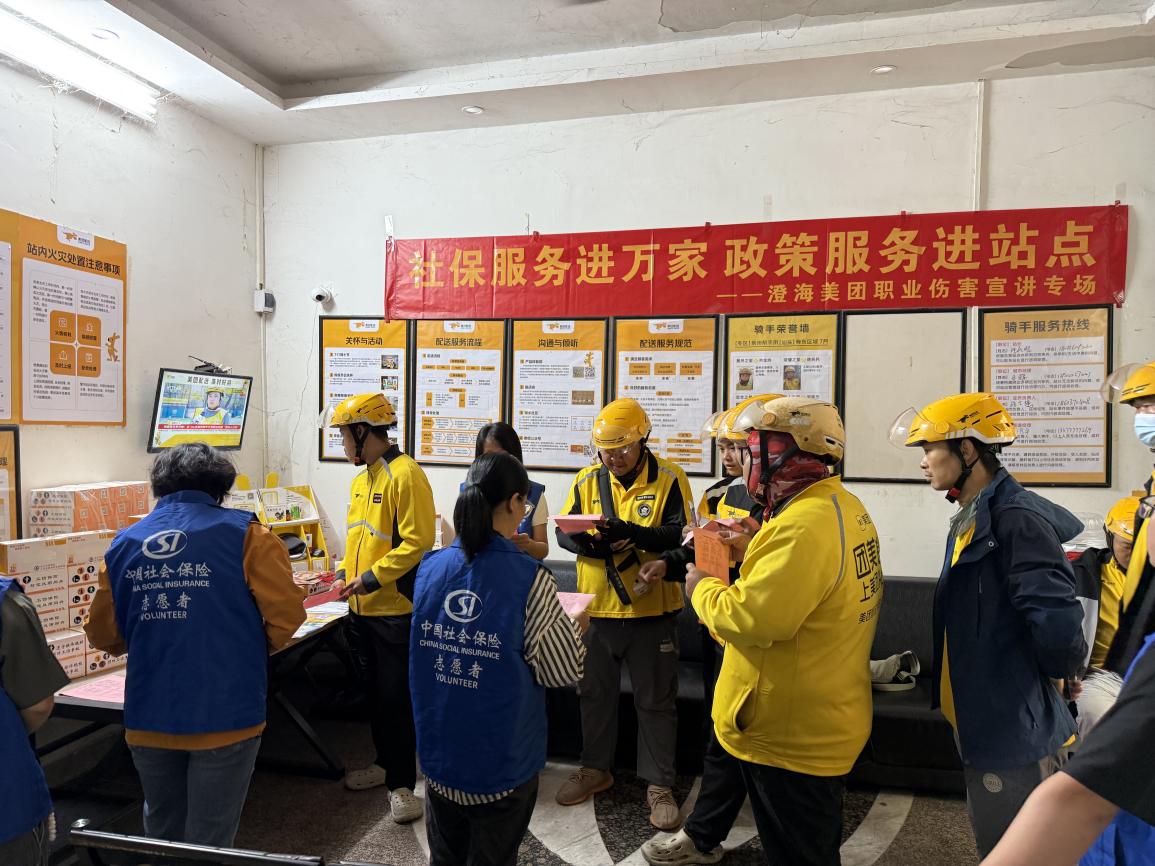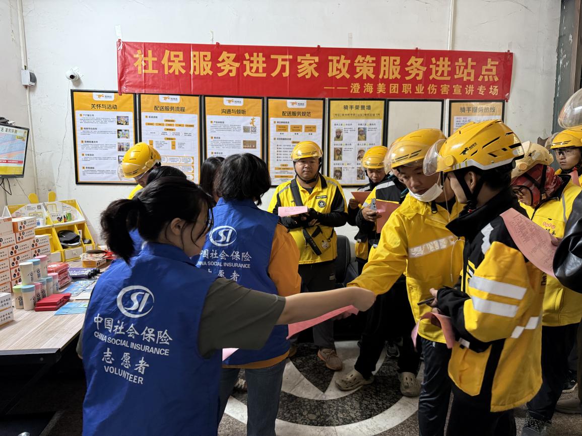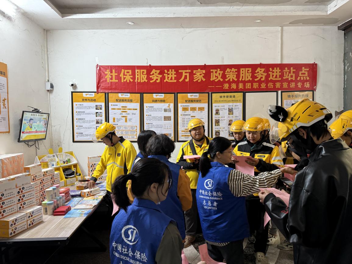 澄海区美团业务站点共有150位专送骑手,每天接单量达7000余单,本次活动选址于人流较为集中的美团业务站点,旨在直接面向新就业形态劳动者这一重点群体,打通社保政策宣传的“最后一公里”。醒目的横幅、整齐摆放的政策宣传折页、精心准备的小礼品,营造出浓厚的活动氛围,吸引了众多外卖骑手、站点管理人员及过往市民的驻足关注。澄海分局的工作人员聚焦职工参保登记、养老保险待遇计算与发放、个人养老金制度详解、就业创业补贴申领、职业伤害确认和预防、打击欺诈骗保行为等社会关注度高、与群众切身利益密切相关的热点难点问题,准备了详实的解答材料和通俗易懂的宣传品。区人社局与人寿保险汕头分公司的工作人员则协同进行社保政策的全面宣传,形成了政策宣讲的合力。