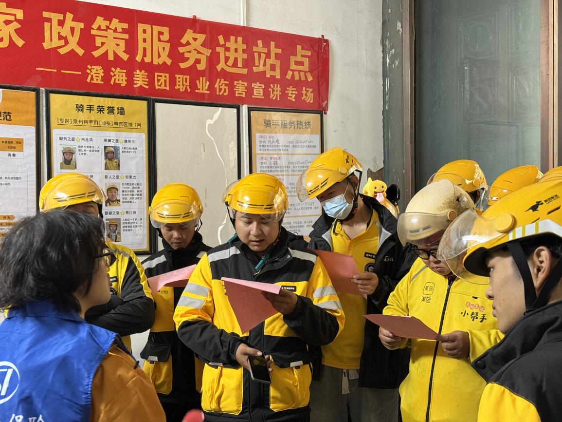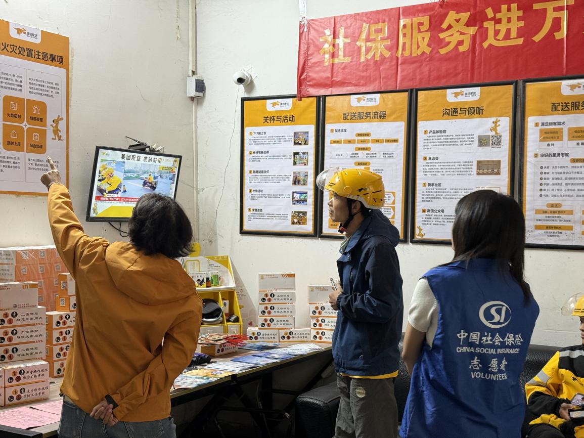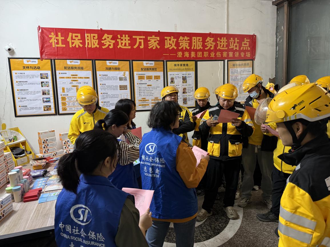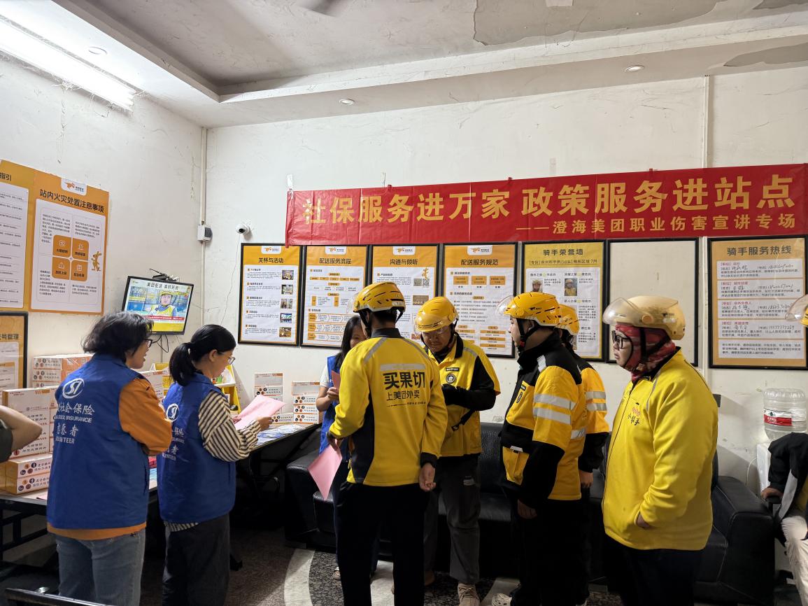 澄海区美团业务站点共有150位专送骑手,每天接单量达7000余单,本次活动选址于人流较为集中的美团业务站点,旨在直接面向新就业形态劳动者这一重点群体,打通社保政策宣传的“最后一公里”。醒目的横幅、整齐摆放的政策宣传折页、精心准备的小礼品,营造出浓厚的活动氛围,吸引了众多外卖骑手、站点管理人员及过往市民的驻足关注。澄海分局的工作人员聚焦职工参保登记、养老保险待遇计算与发放、个人养老金制度详解、就业创业补贴申领、职业伤害确认和预防、打击欺诈骗保行为等社会关注度高、与群众切身利益密切相关的热点难点问题,准备了详实的解答材料和通俗易懂的宣传品。区人社局与人寿保险汕头分公司的工作人员则协同进行社保政策的全面宣传,形成了政策宣讲的合力。