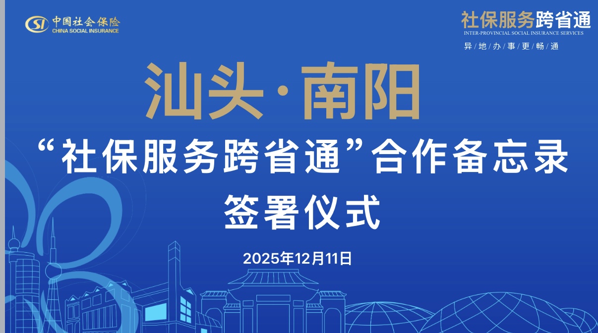 为更好地服务跨省参保群众和企业,解决社保领域跨区域办事难的问题,汕头市社会保险基金管理局与河南省南阳市社会保险中心于12月11日下午通过线上视频连线方式,正式签署《社保经办服务“跨省通办”合作备忘录》。截至目前,汕头市社保局已经与广西南宁、江西赣州、湖南永州等6省10市的社保经办机构实现了“跨省通办”合作,不断加强社保经办服务跨区域联动协作。
