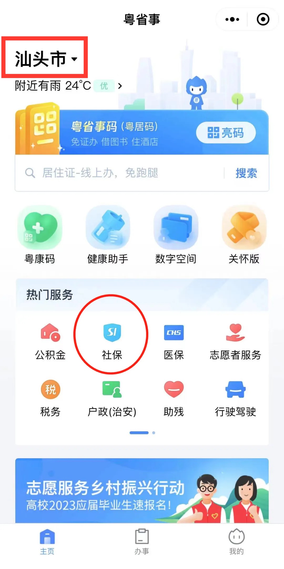 进入“粤省事”微信小程序后,须先在左上角将所在城市修改为“汕头”,再选择【社保】业务,才能正确进入业务办理界面。
