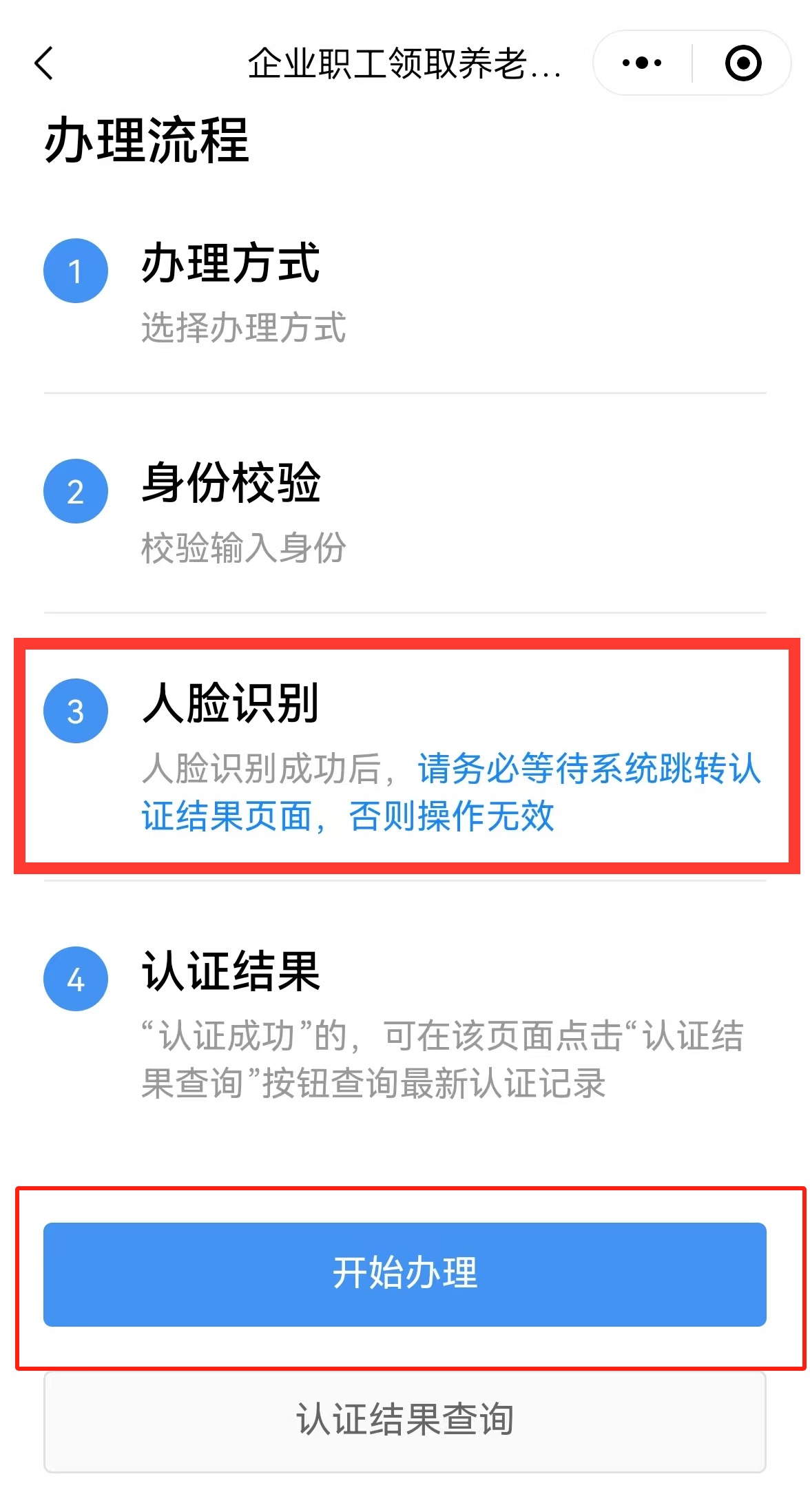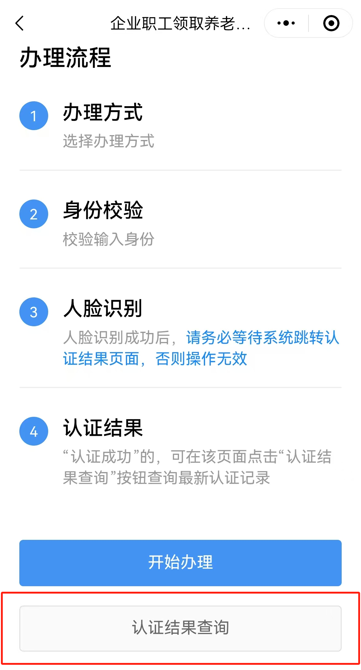 在业务办理页面,点击“认证结果查询”即可查询申办人的认证信息。(截图以“企业职工领取养老保险待遇资格认证”为例)