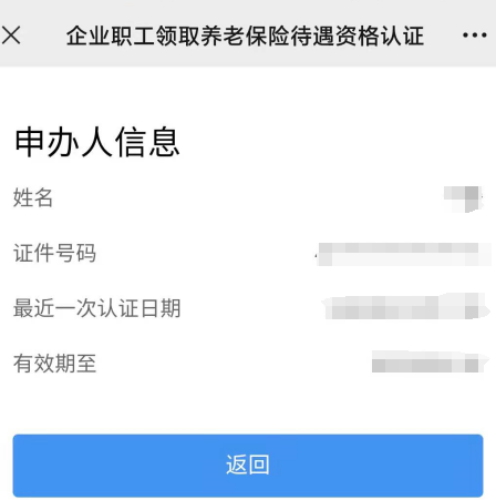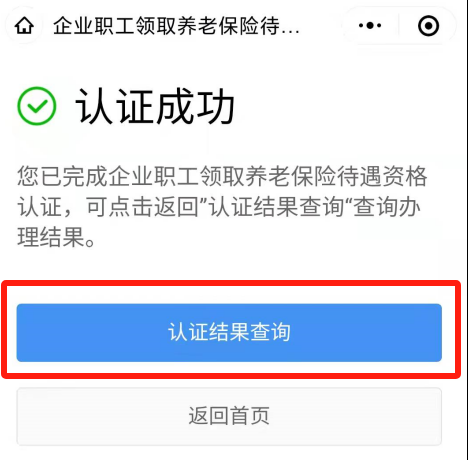 在业务办理成功页,点击“认证结果查询”即可查询申办人的认证信息。(截图以“企业职工领取养老保险待遇资格认证”为例)