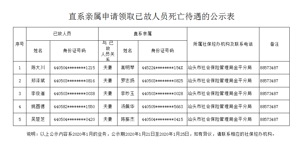 市社保局金平分局《直系亲属申请领取已故人员死亡待遇的公示表》(2020.01.20)