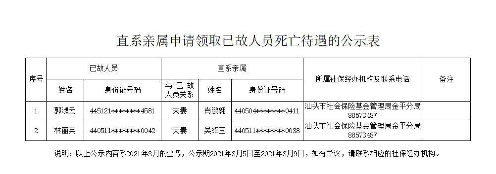 市社保局金平分局《直系亲属申请领取已故人员死亡待遇的公示表》(2021.03.05)