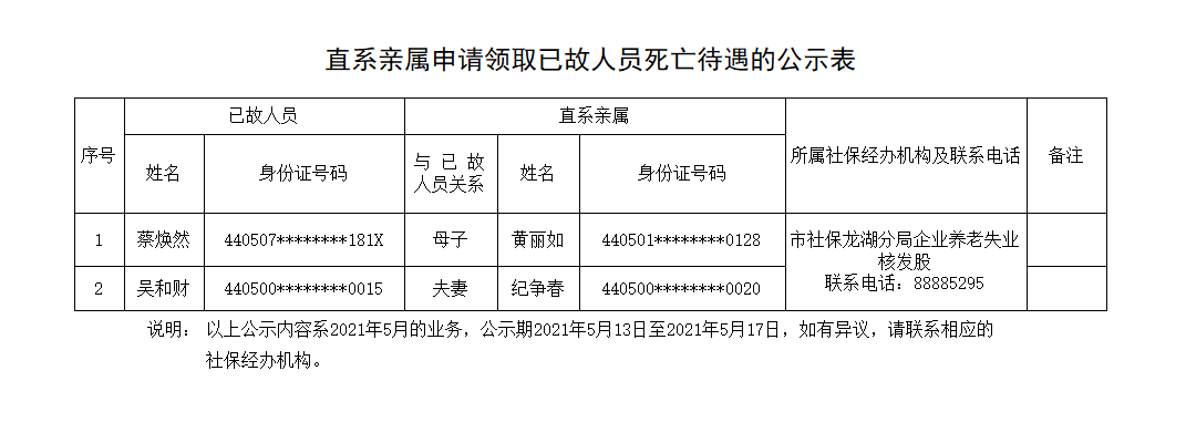 市社保局龙湖分局《直系亲属申请领取已故人员死亡待遇的公示表》(2021.05.13)