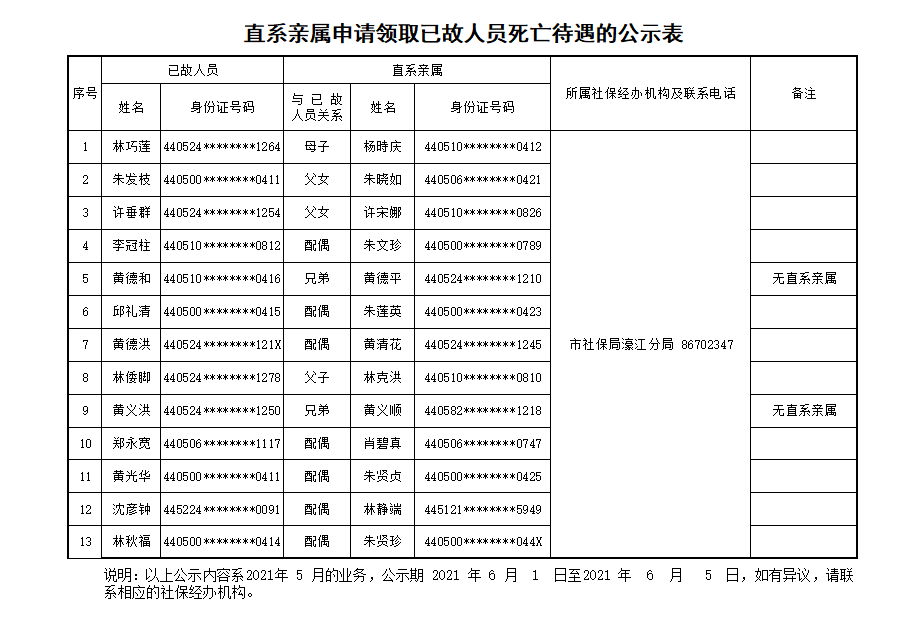 市社保局濠江分局《直系亲属申请领取已故人员死亡待遇的公示表》(2021.06.01)