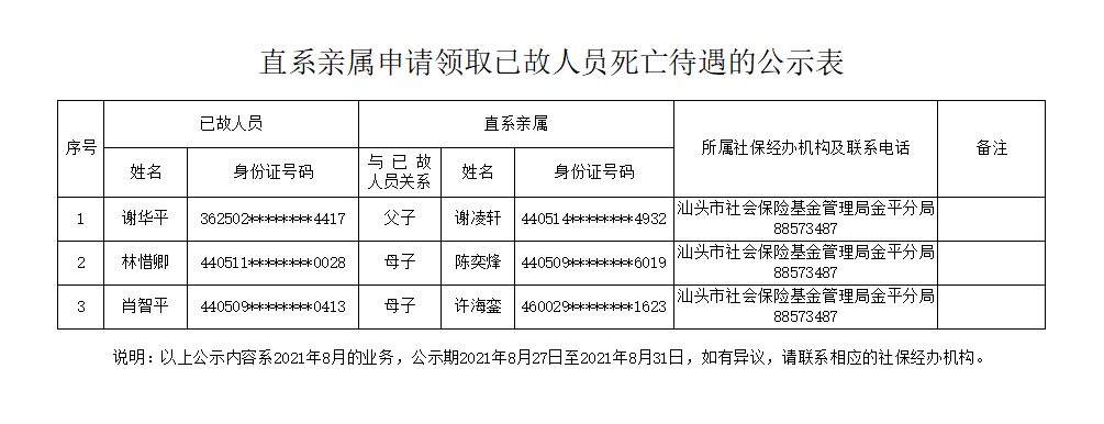 市社保局金平分局《直系亲属申请领取已故人员死亡待遇的公示表》(2021.08.27)