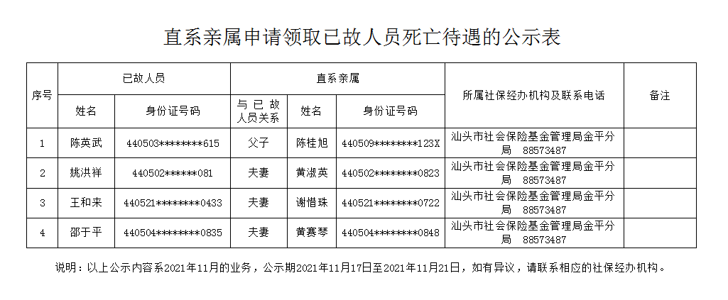 市社保局金平分局《直系亲属申请领取已故人员死亡待遇的公示表》(2021.11.17)