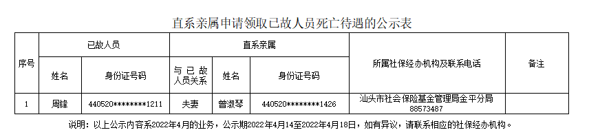市社保局金平分局《直系亲属申请领取已故人员死亡待遇的公示表》(2022.04.14)