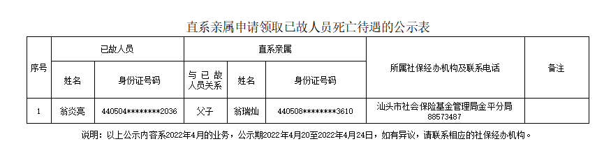 市社保局金平分局《直系亲属申请领取已故人员死亡待遇的公示表》(2022.04.20)