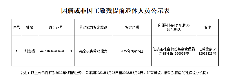 市社保局龙湖分局关于刘崇强因病或非因工致残提前退休的公示(2022.04.28)