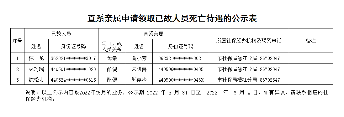 市社保局濠江分局《直系亲属申请领取已故人员死亡待遇的公示表》(2022.05.31)