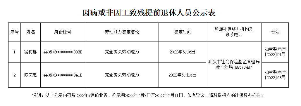 市社保局金平分局关于翁树群等2人因病或非因工致残提前退休的公示(2022.07.07)