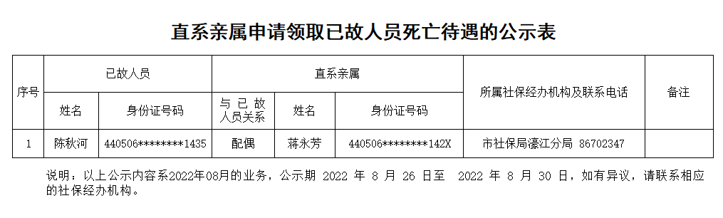 市社保局濠江分局《直系亲属申请领取已故人员死亡待遇的公示表》(2022.08.26)