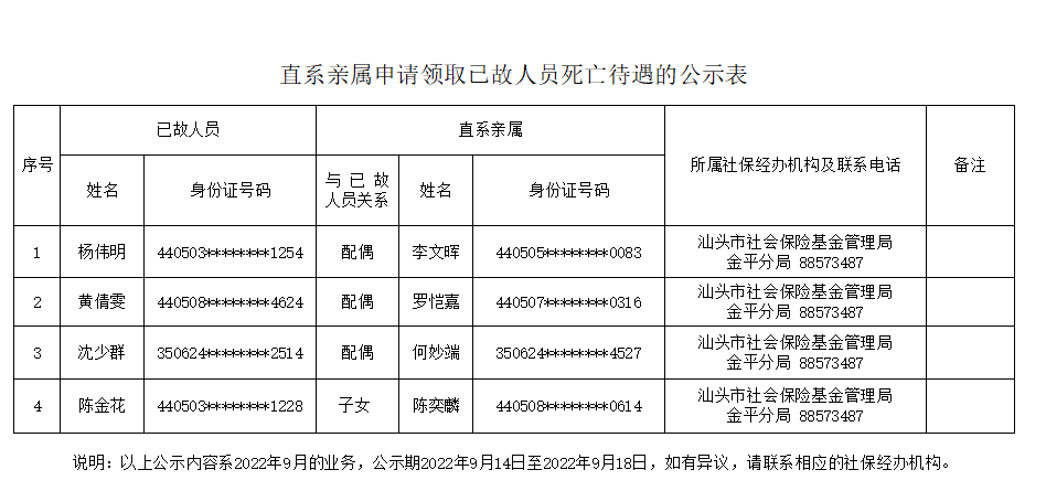市社保局金平分局《直系亲属申请领取已故人员死亡待遇的公示表》(2022.09.14)