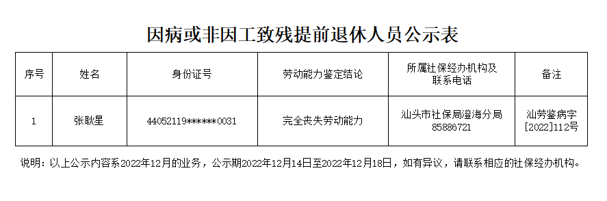 市社保局澄海分局关于张耿星因病或非因工致残提前退休的公示(2022.12.14)