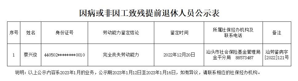 市社保局金平分局关于蔡兴俊因病或非因工致残提前退休的公示(2023.01.12)