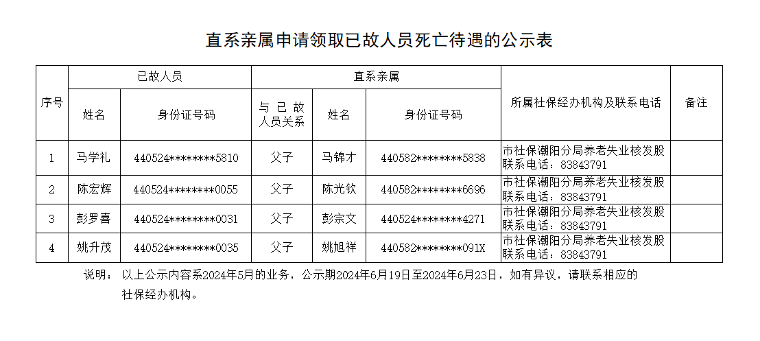 市社保局潮阳分局《直系亲属申请领取已故人员死亡待遇的公示表》(2024.06.19)