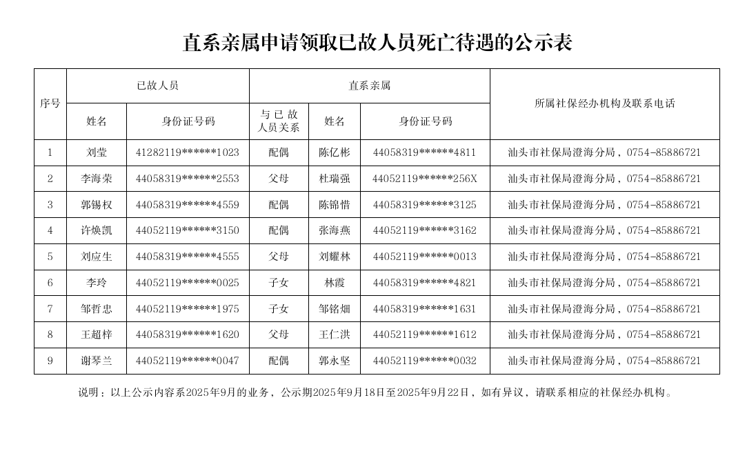 市社保局澄海分局《直系亲属申请领取已故人员死亡待遇的公示表》(2025.09.18)