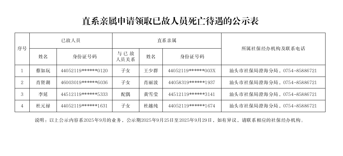市社保局澄海分局《直系亲属申请领取已故人员死亡待遇的公示表》(2025.09.25)