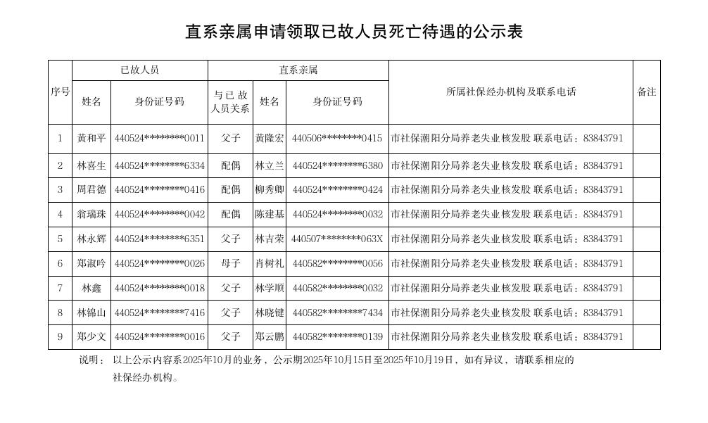 市社保局潮阳分局《直系亲属申请领取已故人员死亡待遇的公示表》(2025.10.15)