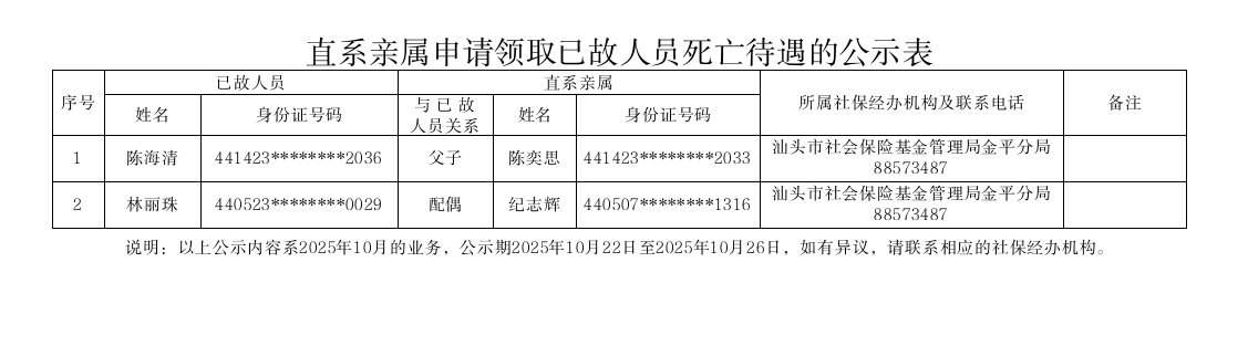 市社保局金平分局《直系亲属申请领取已故人员死亡待遇的公示表》(2025.10.22)