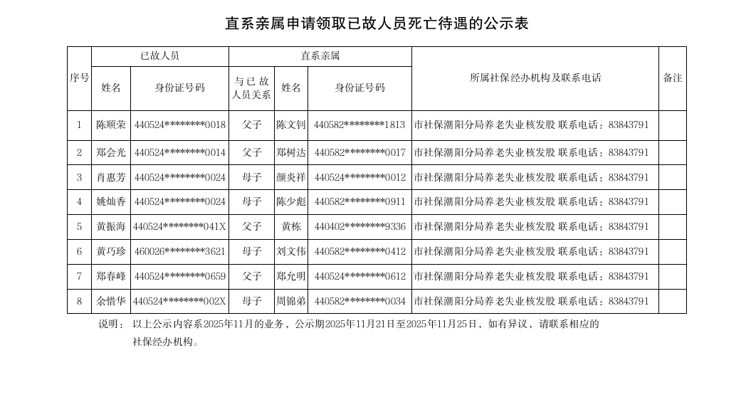 市社保局潮阳分局《直系亲属申请领取已故人员死亡待遇的公示表》(2025.11.21)