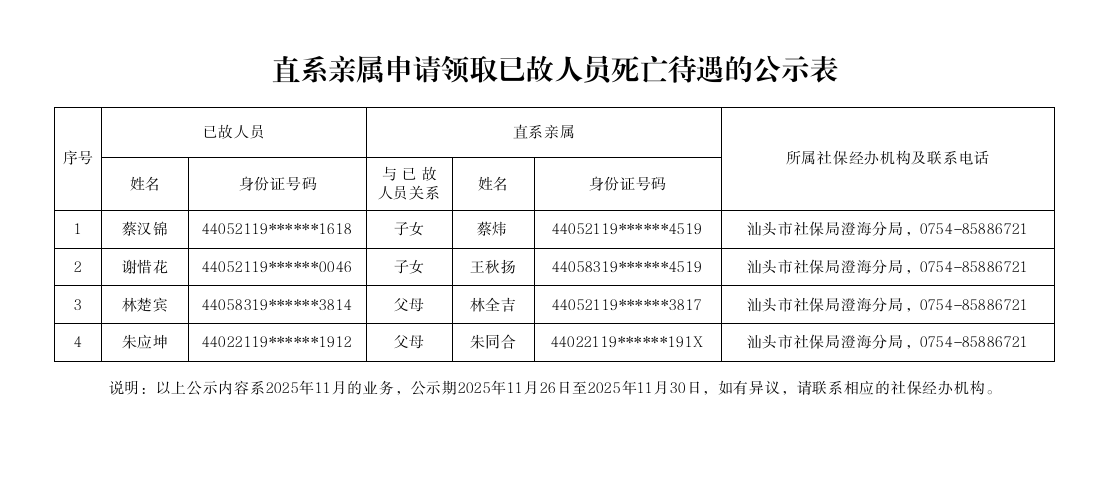 市社保局澄海分局《直系亲属申请领取已故人员死亡待遇的公示表》(2025.11.26)