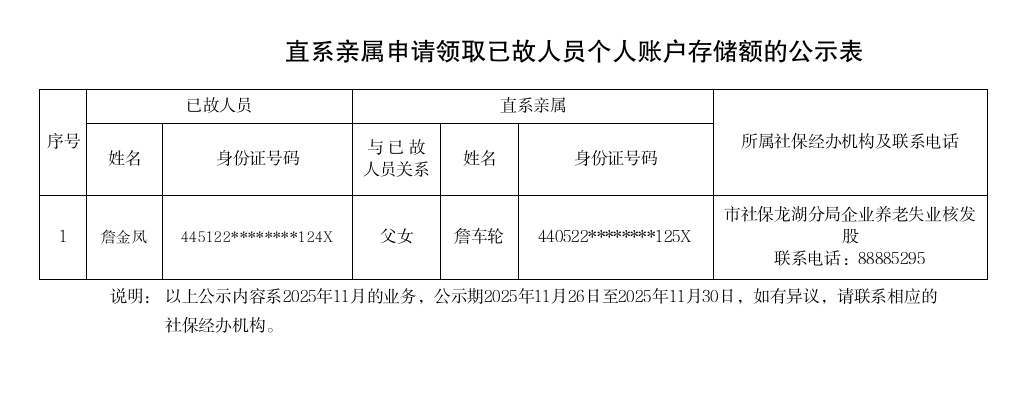 市社保局龙湖分局《直系亲属申请领取已故人员死亡待遇的公示表》(2025.11.26)