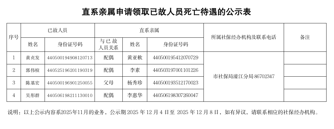 市社保局濠江分局《直系亲属申请领取已故人员死亡待遇的公示表》(2025.12.04)