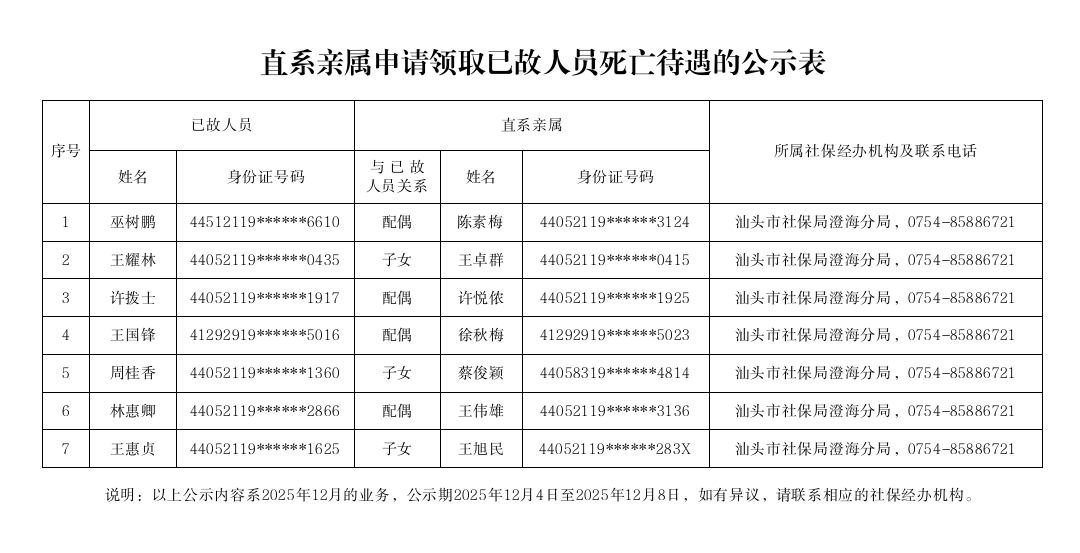 市社保局澄海分局《直系亲属申请领取已故人员死亡待遇的公示表》(2025.12.04)