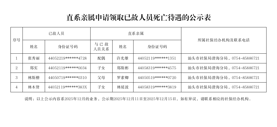 市社保局澄海分局《直系亲属申请领取已故人员死亡待遇的公示表》(2025.12.11)