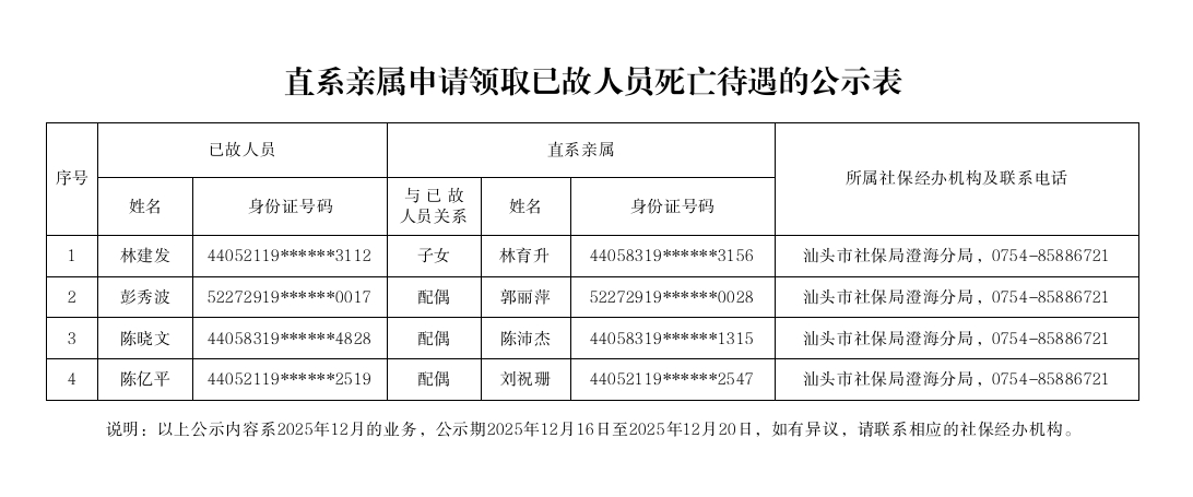 市社保局澄海分局《直系亲属申请领取已故人员死亡待遇的公示表》(2025.12.16)