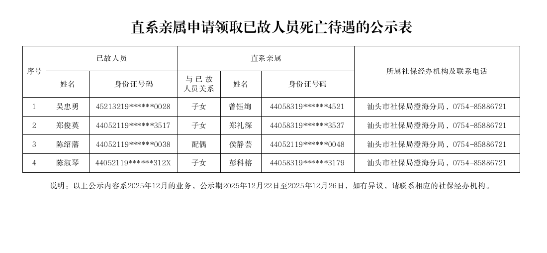 市社保局澄海分局《直系亲属申请领取已故人员死亡待遇的公示表》(2025.12.22)