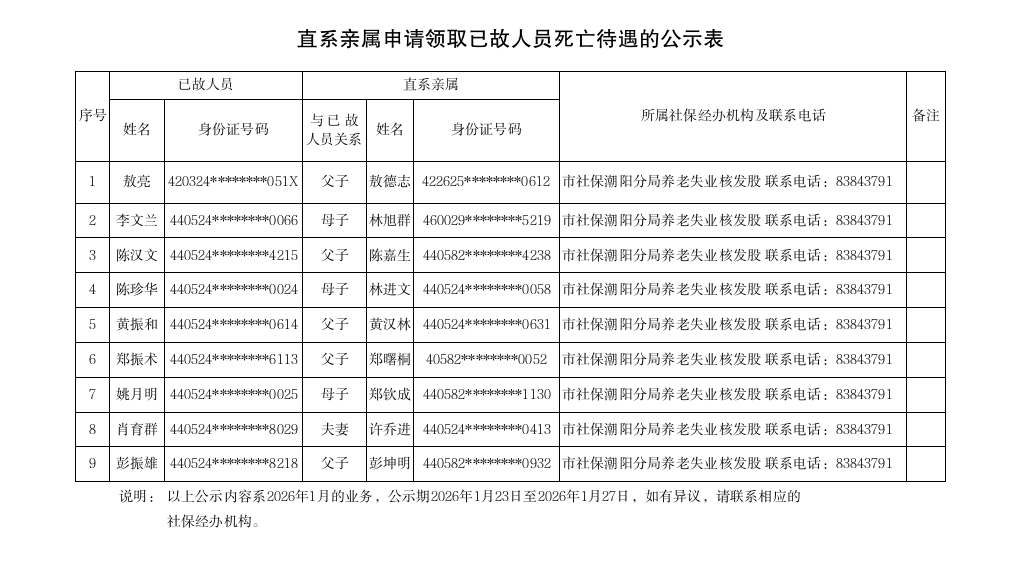 市社保局潮阳分局《直系亲属申请领取已故人员死亡待遇的公示表》(2026.01.23)