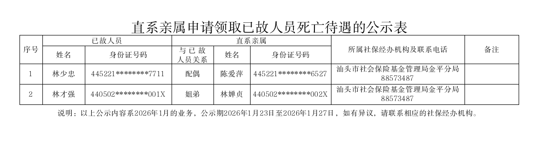 市社保局金平分局《直系亲属申请领取已故人员死亡待遇的公示表》(2026.01.23)