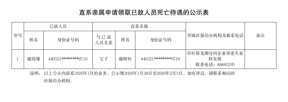市社保局龙湖分局《直系亲属申请领取已故人员死亡待遇的公示表》(2026.01.28)