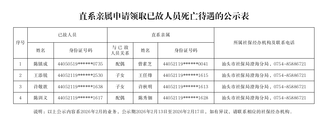 市社保局澄海分局《直系亲属申请领取已故人员死亡待遇的公示表》(2026.02.13)